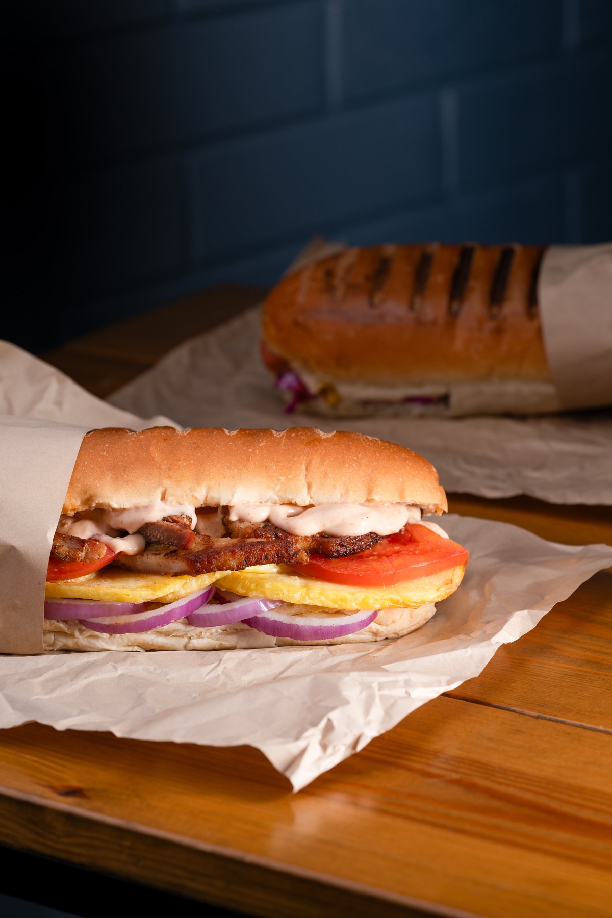 Προζυμένιο ψωμάκι,120g φρέσκο πανσετάκι, τυρί τριμμένο, φρέσκιες πατάτες τηγανητές , ντομάτα, κρεμμύδι, γιαούρτι και ροζ sauce