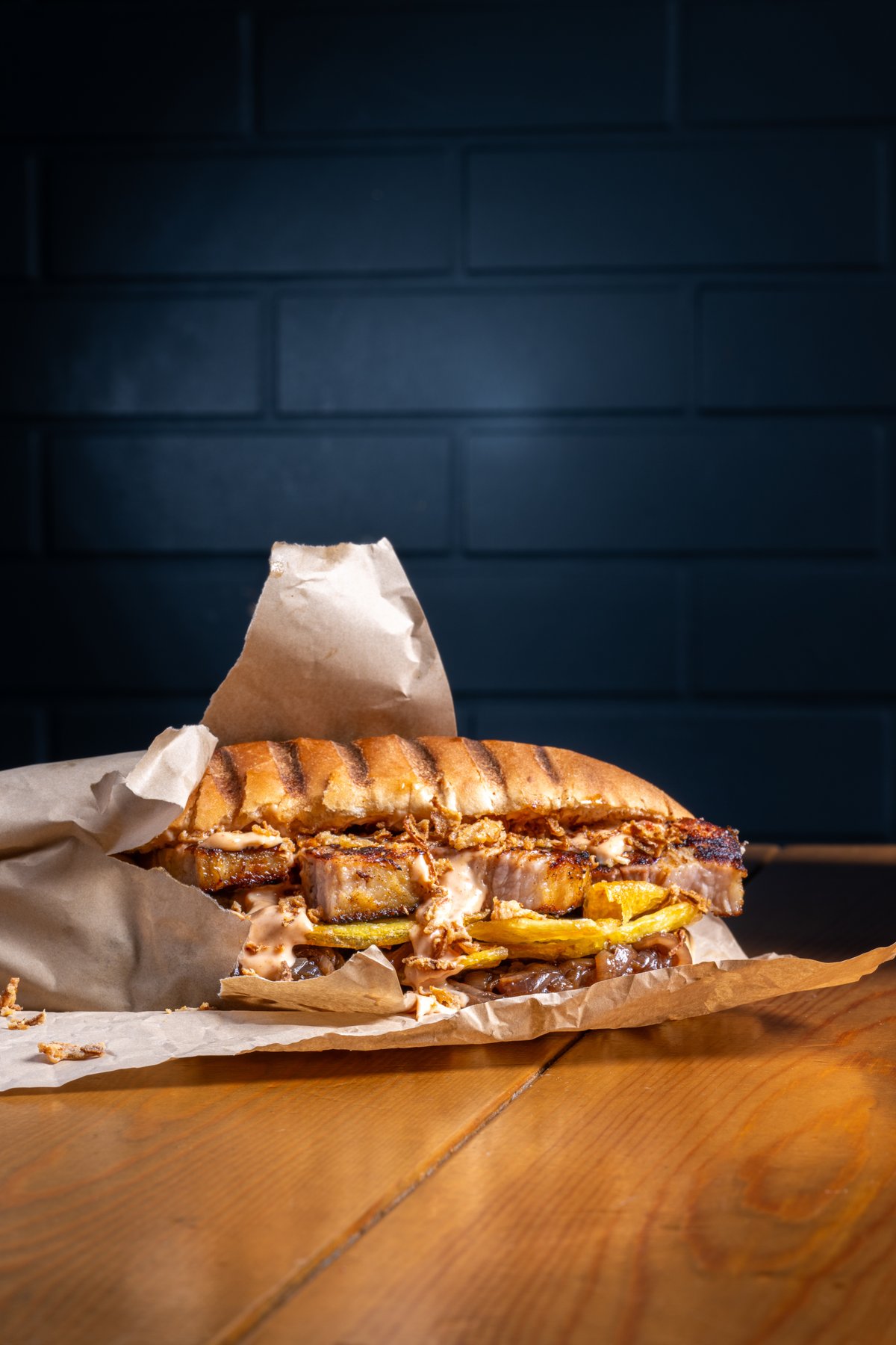 Προζυμένιο ψωμάκι, 140g φρέσκια πανσέτα σουβίτ, φρέσκιες πατάτες τηγανητές, καραμελωμένο και τραγανό κρεμμύδι, και sauce pancetta