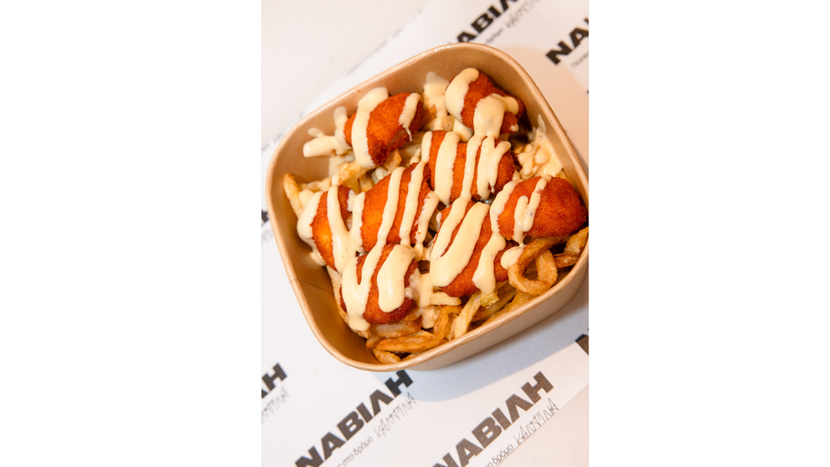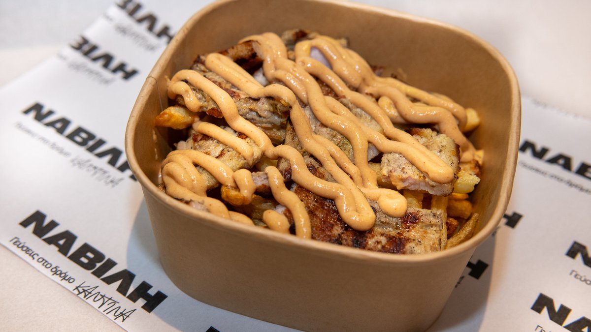 120g κοτομπουκιες, φρέσκιες πατάτες τηγανητές και sauce Navili