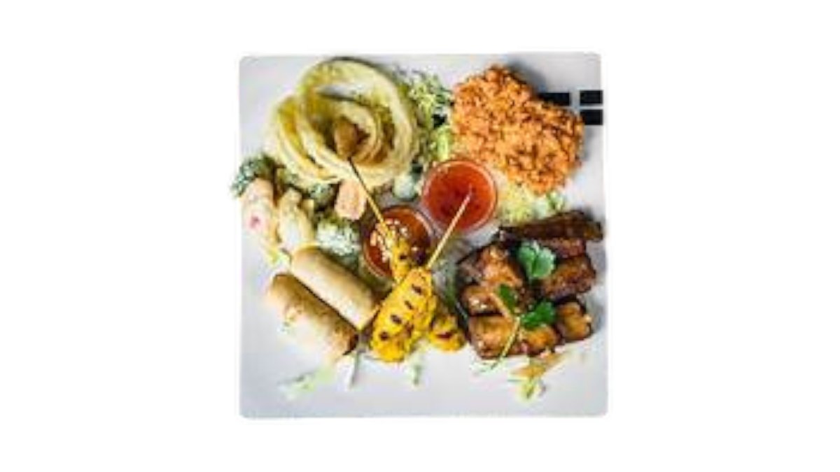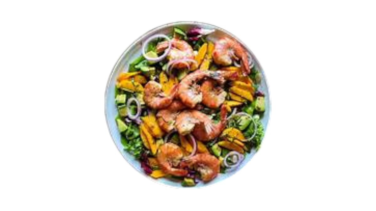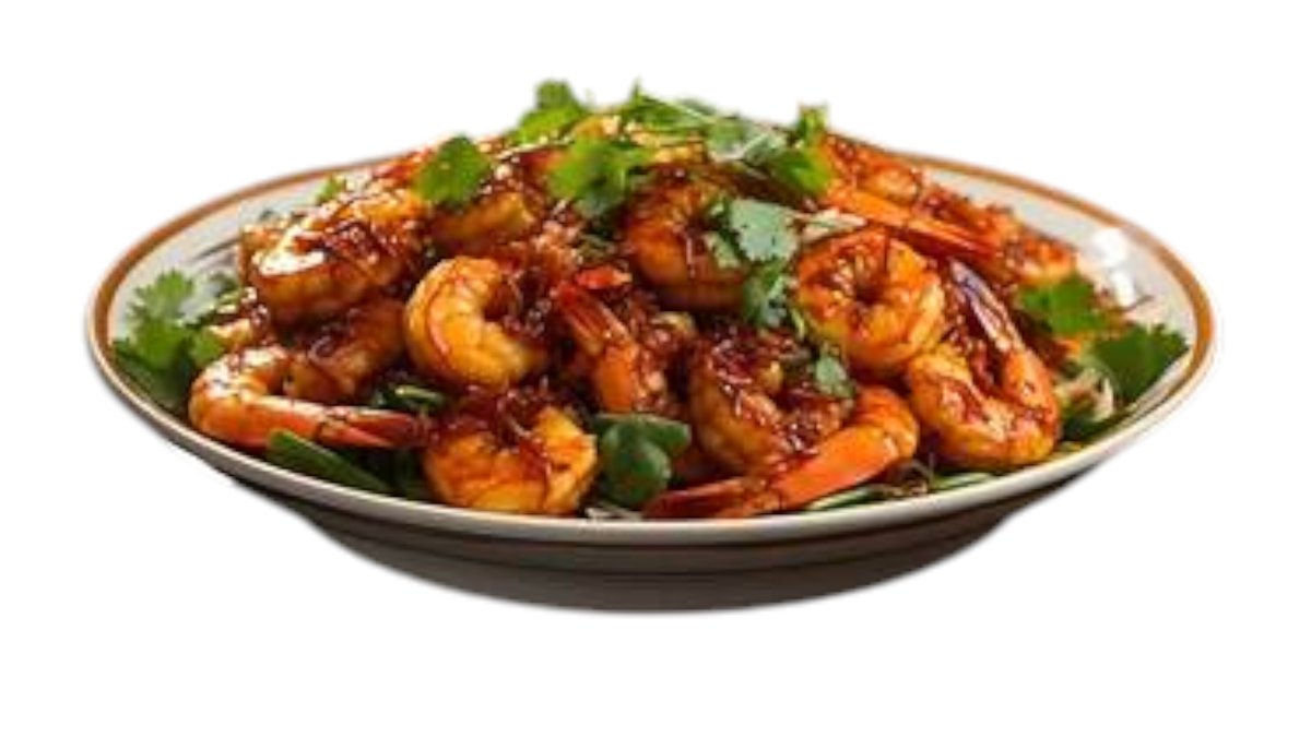 Γαρίδες, καρότα, κρεμμύδια, ανανάς, κόκκινες, πράσινες και κίτρινες πιπεριές. Συνοδεύεται από γαρνιτούρα επιλογής