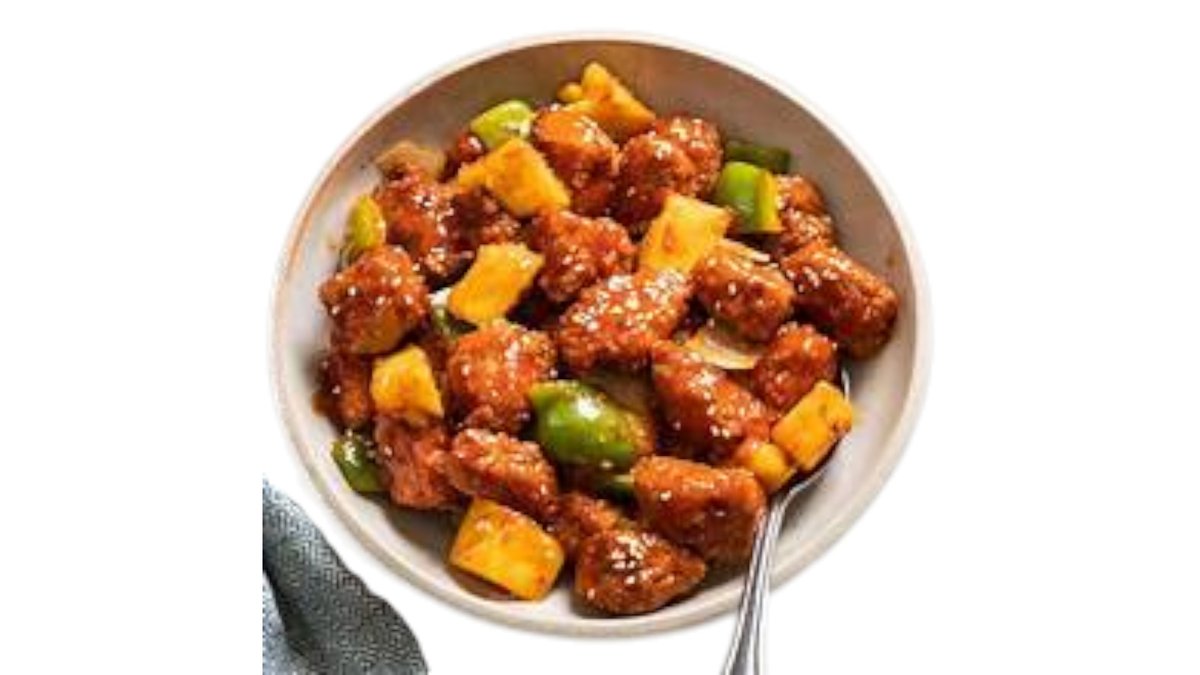 Κοτόπουλο παναρισμένο, καρότα, κρεμμύδια, ανανάς, κόκκινες, πράσινες και κίτρινες πιπεριές. Συνοδεύεται από γαρνιτούρα επιλογής