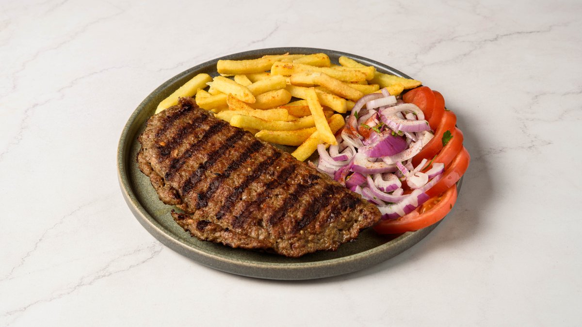 Συνοδεύεται από πίτα κομμένη, ντομάτα, κρεμμύδι, μαϊντανό, φρέσκες τηγανιτές πατάτες και σως της επιλογής σου