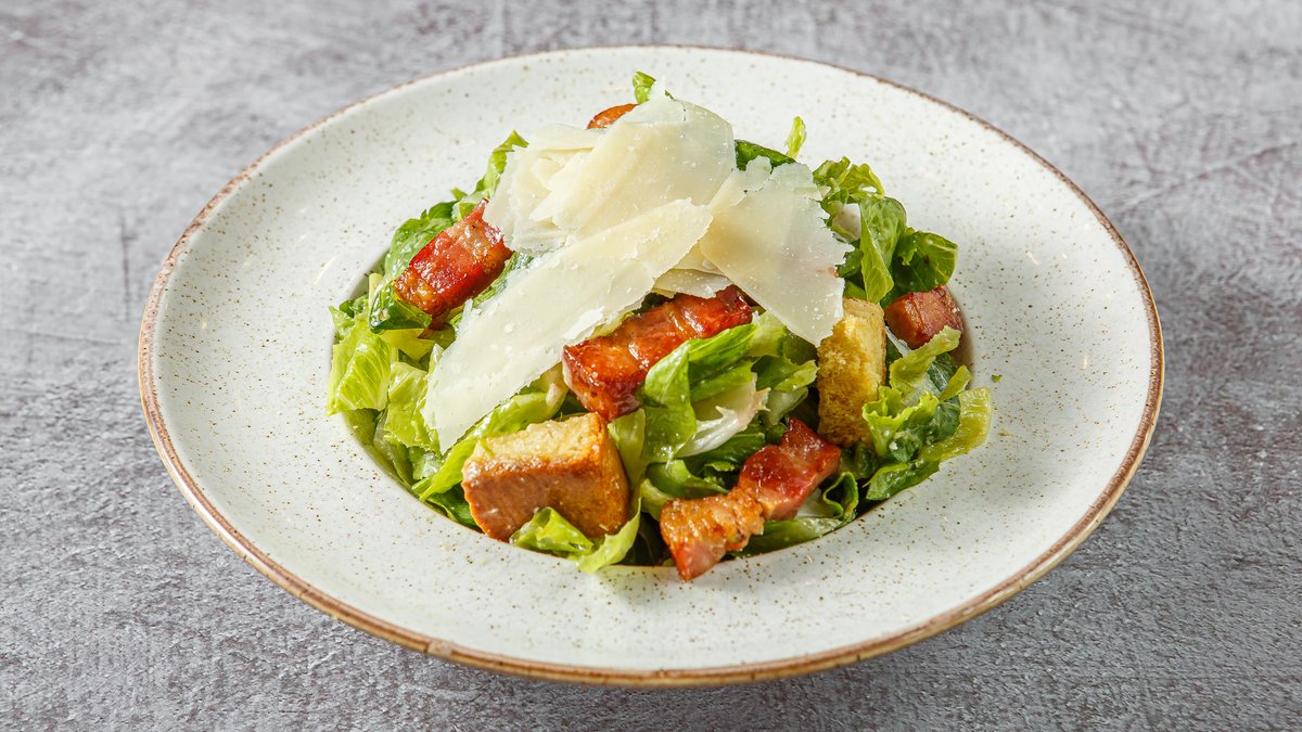 Σαλάτα με iceberg, κρουτόν, Cesar's dressing, κοτόπουλο, προσούτο, flakes παρμεζάνας και ντοματίνια