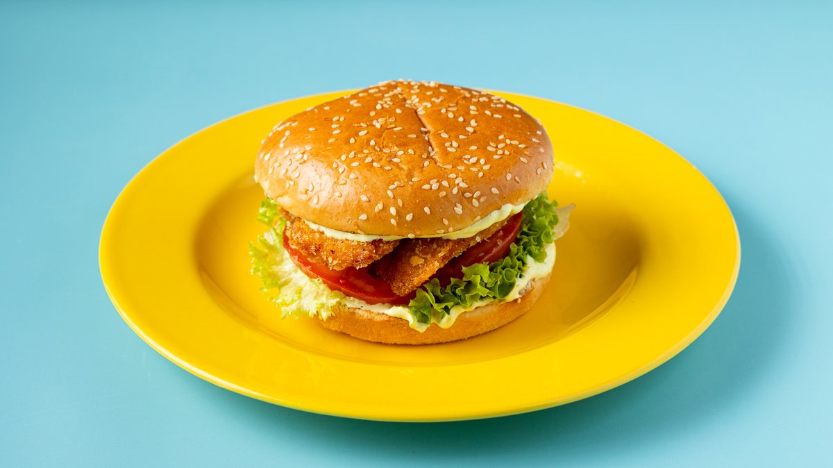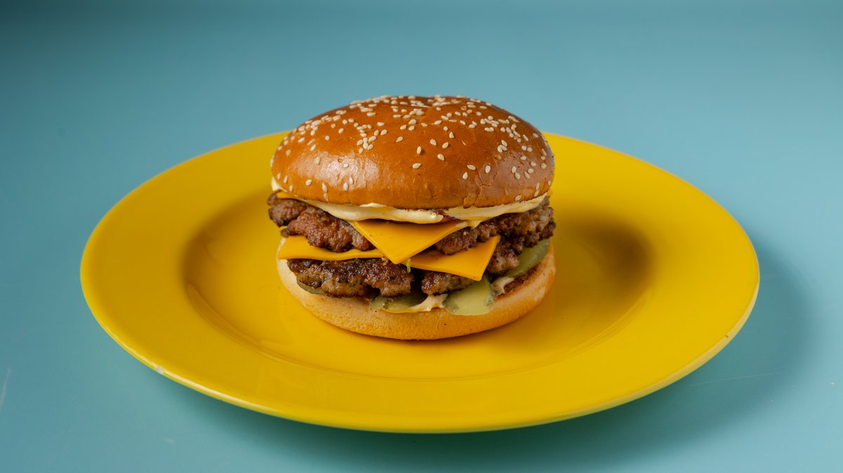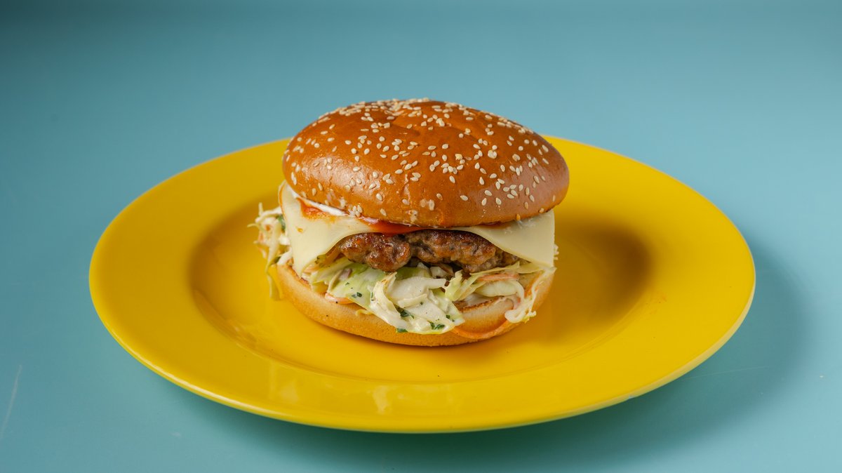 Με μοσχαρίσιο μπιφτέκι, τυρί cheddar, κέτσαπ, μουστάρδα, ταρτάρ sauce
