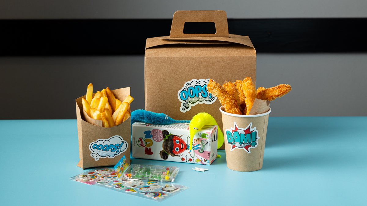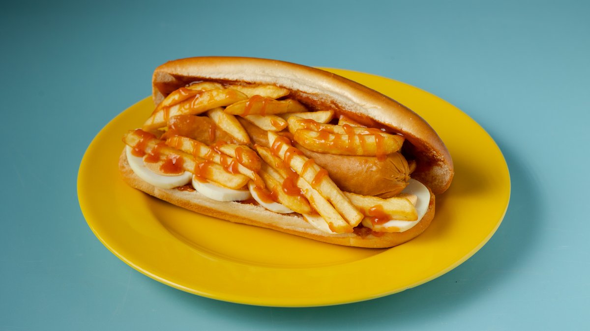 Με λουκάνικο Φρανκφούρτης, μαγιονέζα, κέτσαπ μουστάρδα. Συνοδεύεται από πατάτες τηγανητές και 1 Amita fun και δώρο έκπληξη