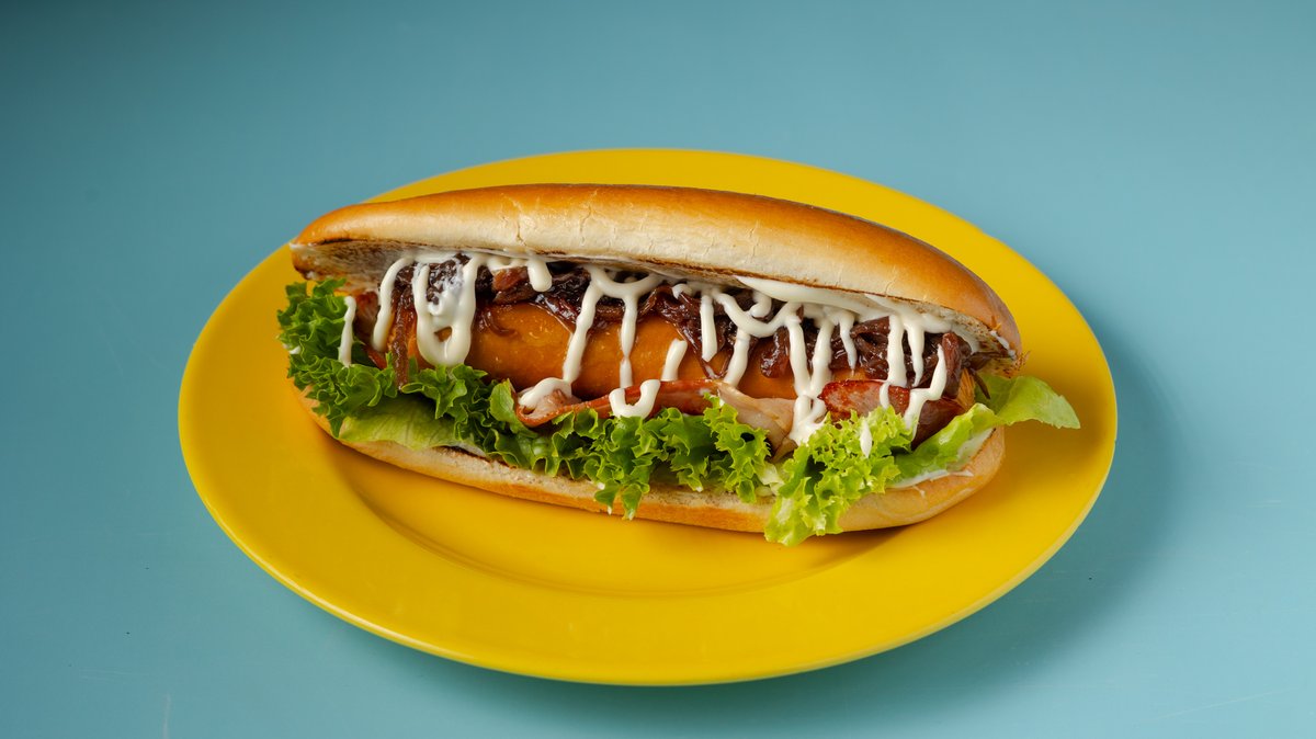 Με λουκάνικο Φρανκφούρτης, μαγιονέζα, ketchup και μουστάρδα