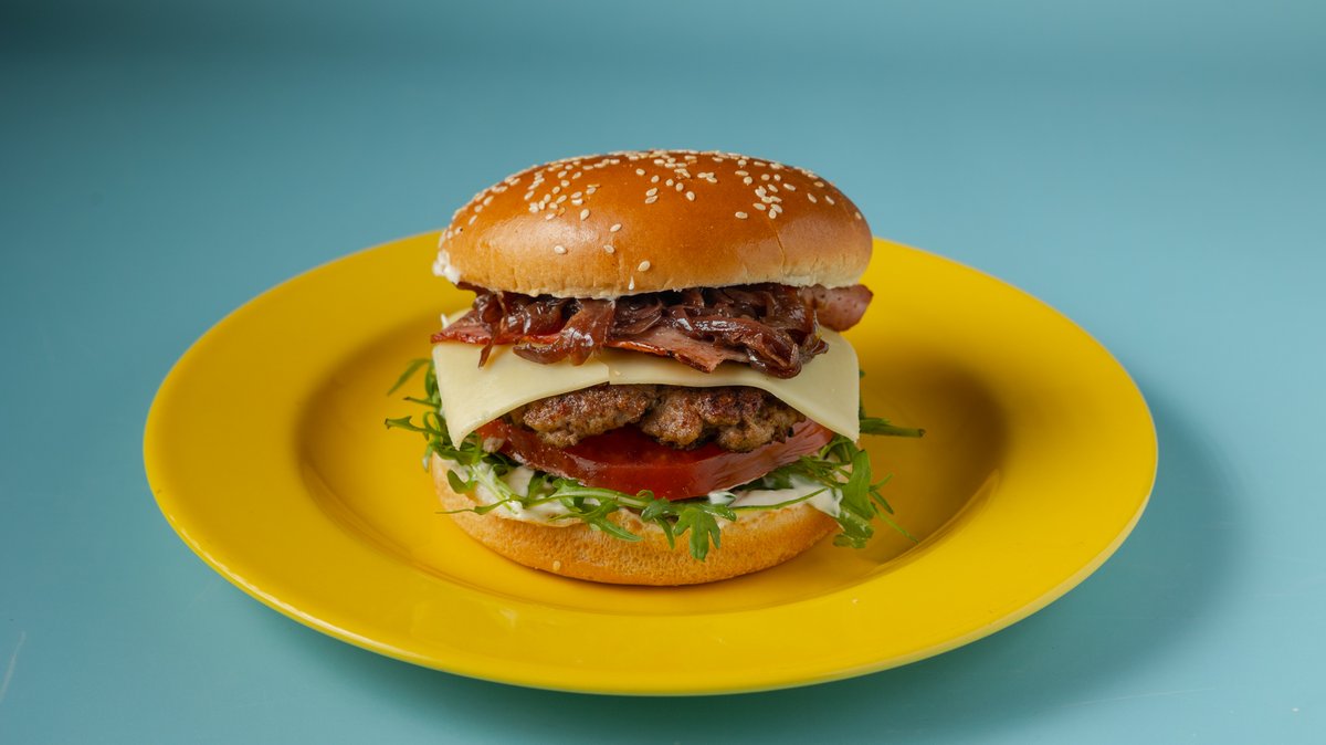 Με μοσχαρίσιο μπιφτέκι, τυρί edam, ρόκα, ντομάτα, bacon, μαγιονέζα, καραμελωμένα κρεμμύδια