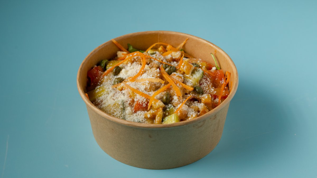Σαλάτα με μαρούλι, ρόκα, ντομάτα, αγγούρι, καρότο, ραπανάκι, κάπαρη, παρμεζάνα, κρουτόν, βινεγκρέτ