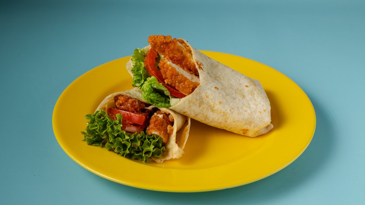 Με τραγανό φιλέτο κοτόπουλο, μαρούλι, ντομάτα και curry sauce