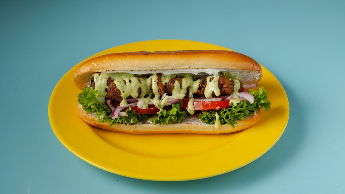 Κολοκυθοκεφτές, μαρούλι, ντομάτα, κρεμμύδι, νηστίσιμη μαγιονέζα, Chimichurri Mayo