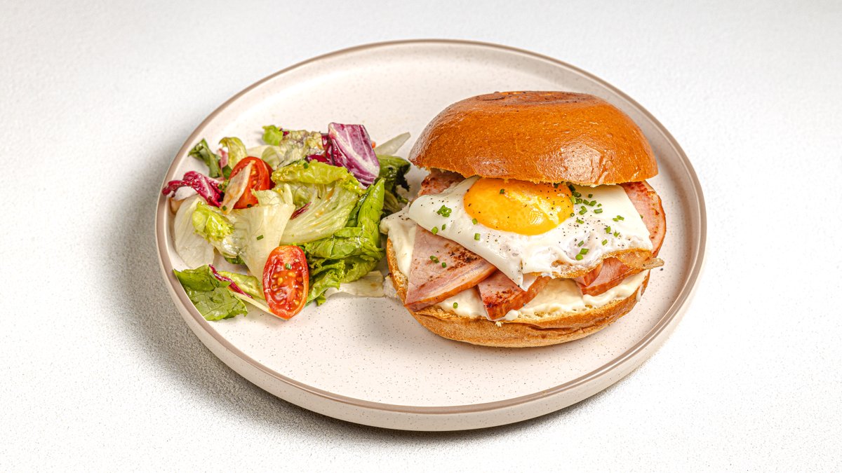 Brioche ψωμάκι με μπεσαμέλ,γαλοπούλα καπνιστή,τηγανητό αυγό και σχοινόπρασο