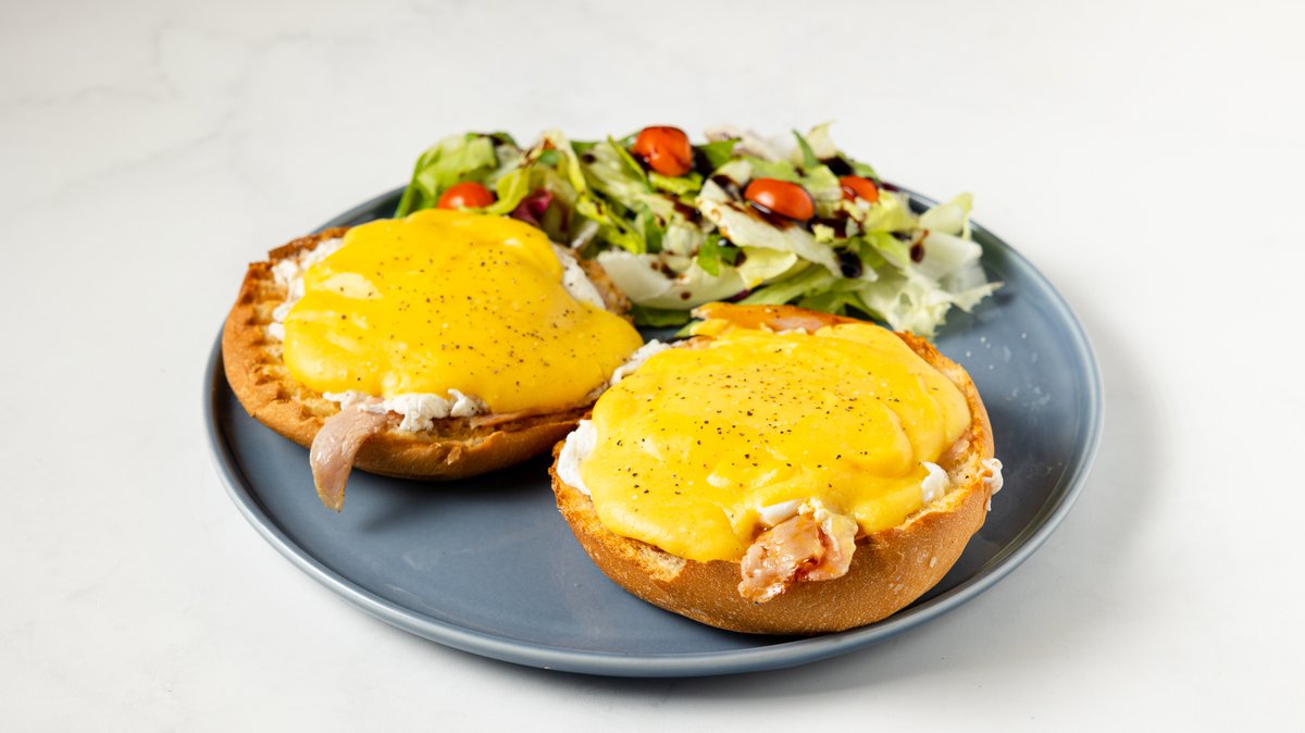 Αυγά ποσέ,καπνιστό ζαμπόν,sauce hollandaise πάνω σε στρογγυλό ψωμάκι brioche