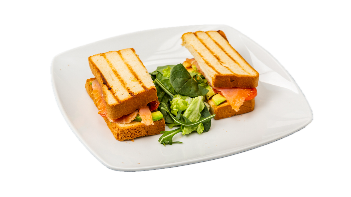 2 φέτες φρυγανισμένο ψωμί ολικής άλεσης με σάλτσα guacamole,καπνιστό σολομό και cream cheese