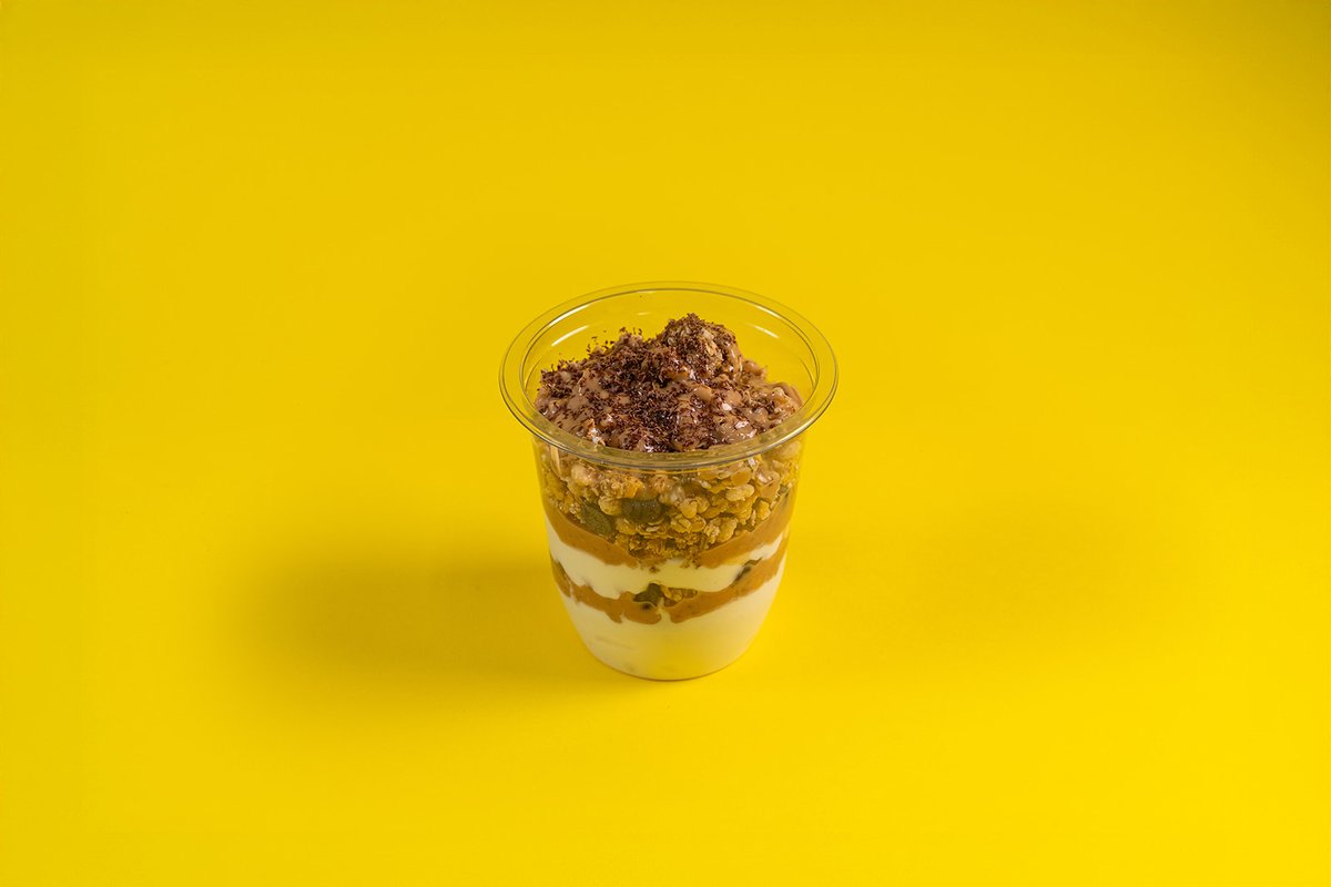Με στραγγιστό ελληνικό γιαούρτι 2%, φυστικοβούτυρο, granola και σταγόνες μαύρης σοκολάτας