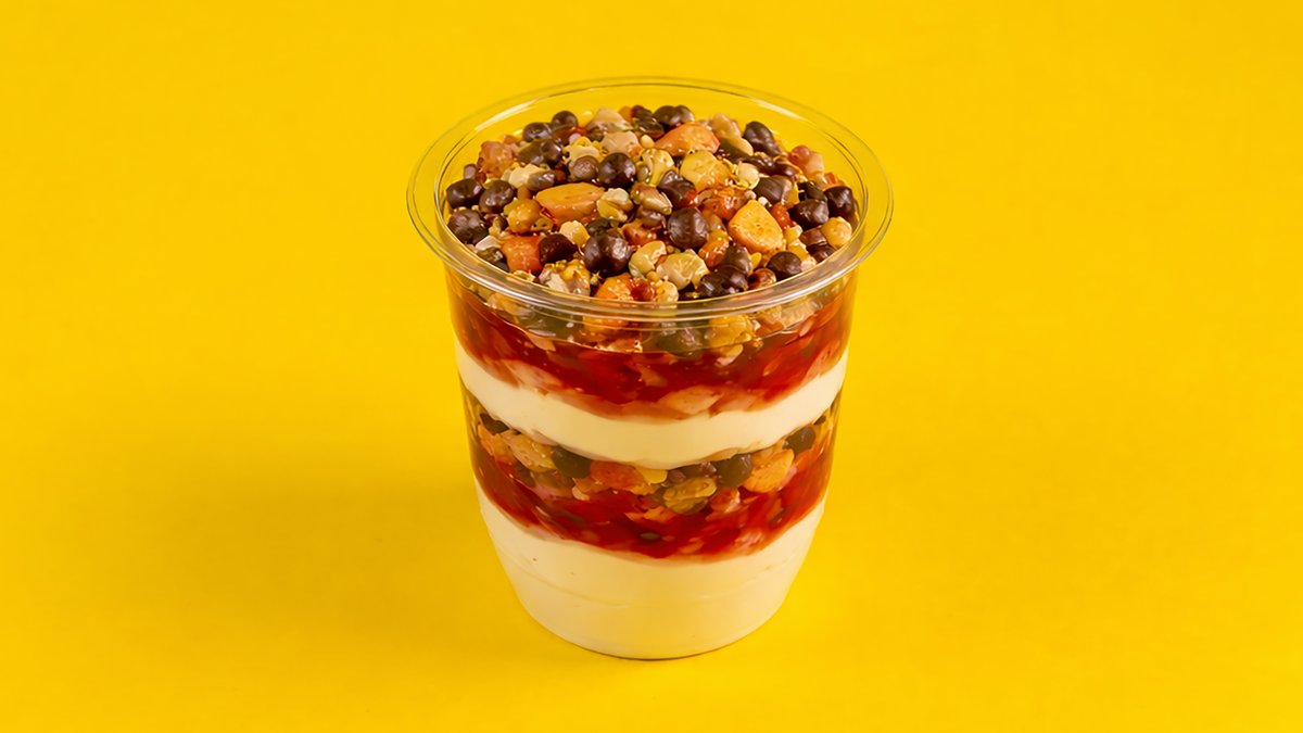 Με στραγγιστό γιαούρτι 2%, σπιτική μαρμελάδα φράουλα, granola, flakes καρύδας και σταγόνες μαύρης σοκολάτας