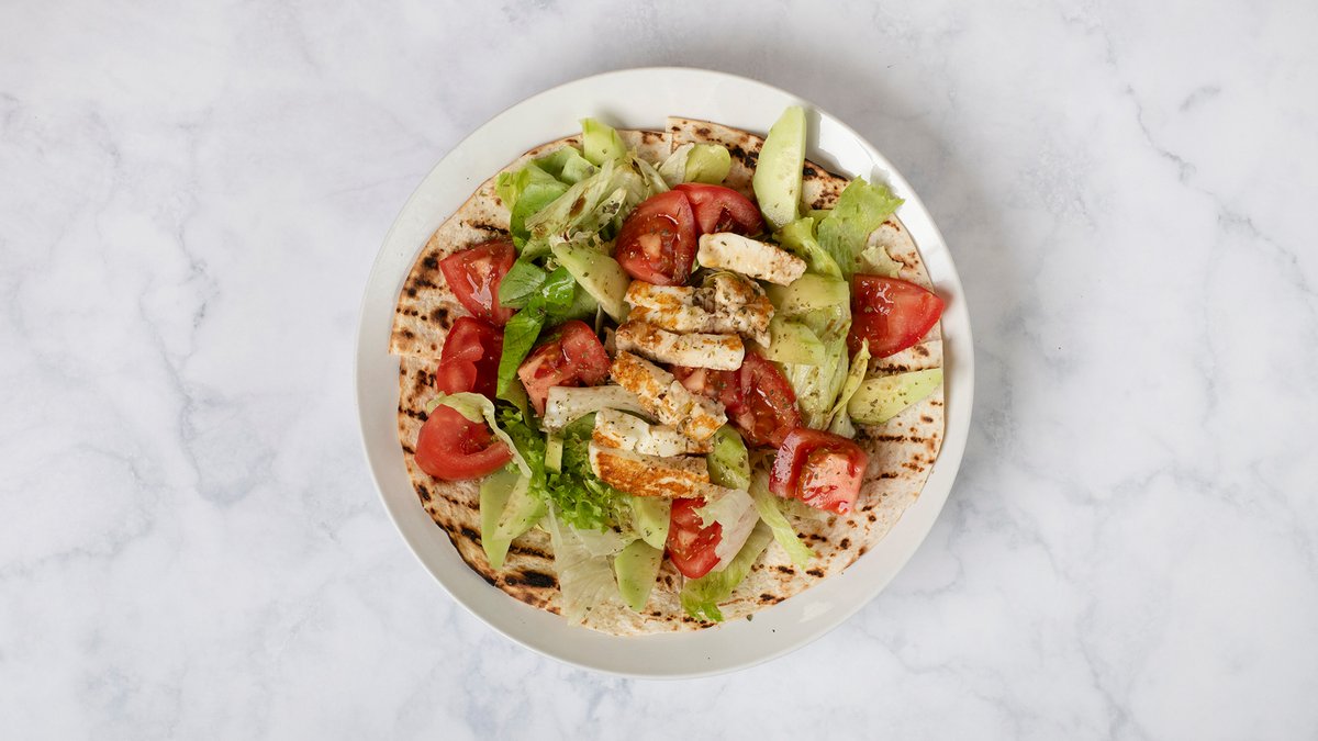 Mε κοτόπουλο, dressing Caesar's, αβοκάντο, καλαμπόκι, πιπεριές, τυρί με φρέσκια σαλάτα εποχής και ντοματίνια