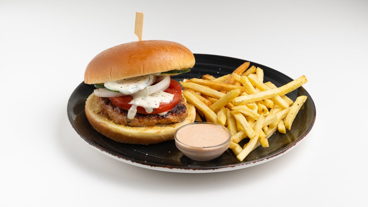 Μπιφτέκι μοσχαρίσιο, ντομάτα, σαλάτα, γιαούρτι, φέτα, ελιές, ρίγανη, κρεμμύδι, πιπεριές, πατάτες τηγανιτές