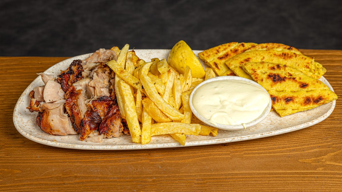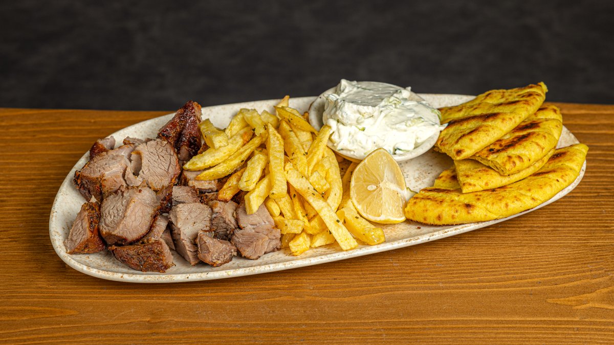 Με κρέας από αρνί και μοσχάρι, ντομάτα, κρεμμύδι, πατάτες, τζατζίκι, καπνιστή πάπρικα και πίτα