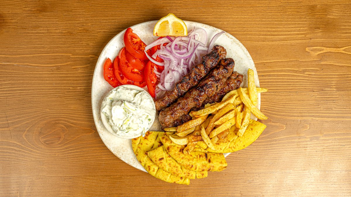Κεμπάπ με φρέσκο αρνίσιο και μοσχαρίσιο κιμά, ντομάτα, τζατζίκι, κρεμμύδι, πατάτες