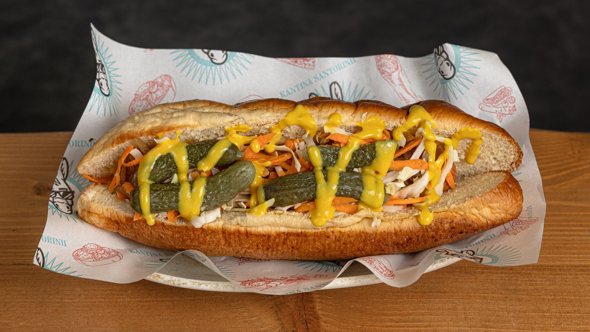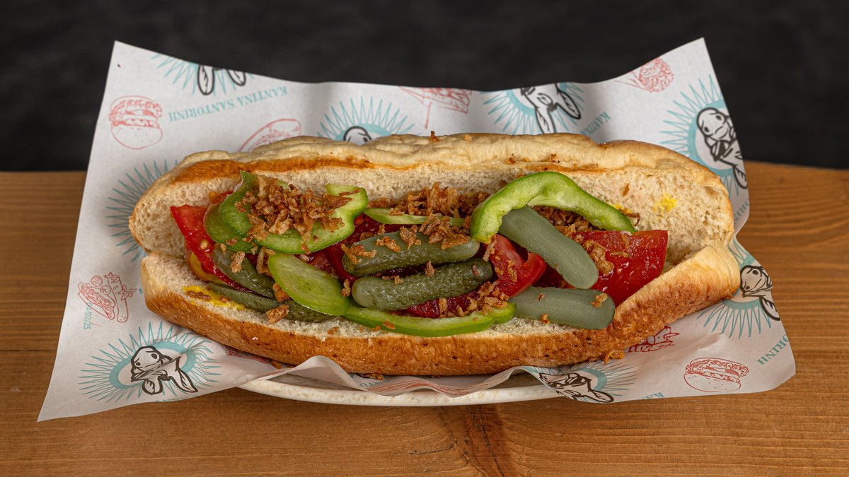 Λουκάνικο Φρανκφούρτης, αγγούρι τουρσί, ντομάτα, πιπεριά και μουστάρδα