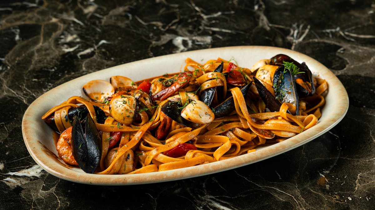 Ταλιατέλες με γαρίδες και φρέσκα μύδια σβησμένα σε ούζο, σάλτσα ψιλοκομμένης ντομάτας και σκόρδο