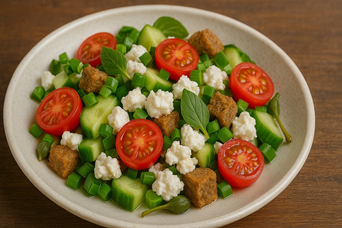 Τοματίνια, ντακάκια, φρέσκο κρεμμύδι, αγγούρι, καπαρόφυλλα, χλωρό τυρί