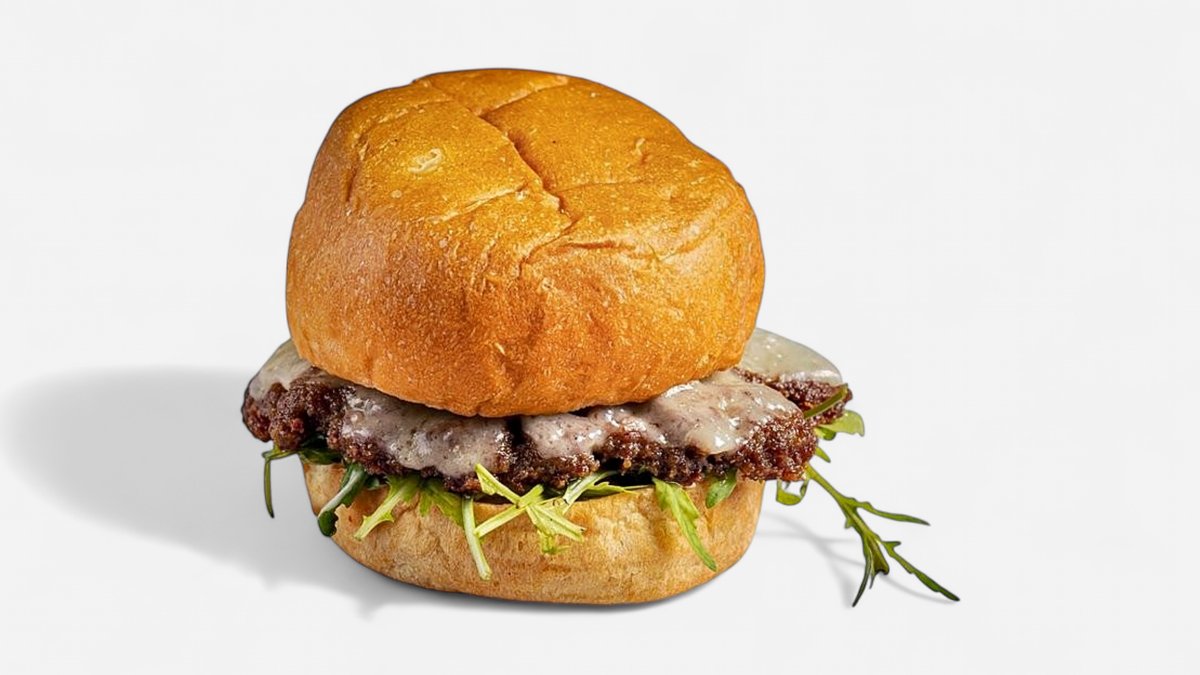 Black Angus μοσχαρίσιο μπιφτέκι, μαγιονέζα τρούφας, τσένταρ, πίκλα αγγουριού, baby ρόκα, κατσικίσιο τυρί και τραγανά κρεμμύδια