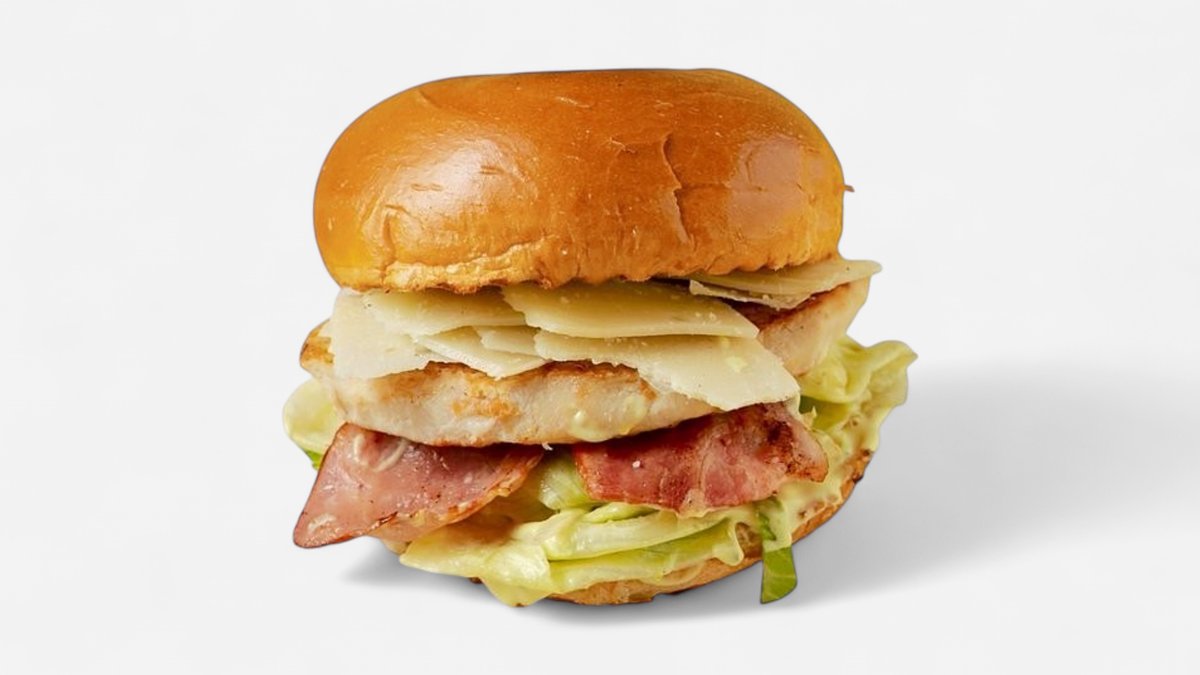 Ψωμί μπριός, μαγιονέζα, ντομάτα, φιλέτο στήθος κοτόπουλο, σως Jack Daniels, τσένταρ και μπέικον