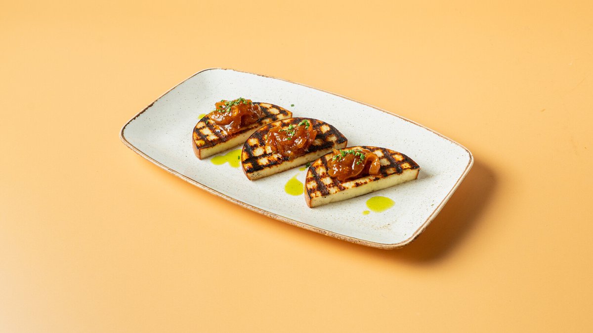 Σχάρας. Συνοδεύεται από μαρμελάδα αποξηραμένων φρούτων και αμύγδαλο φιλέ