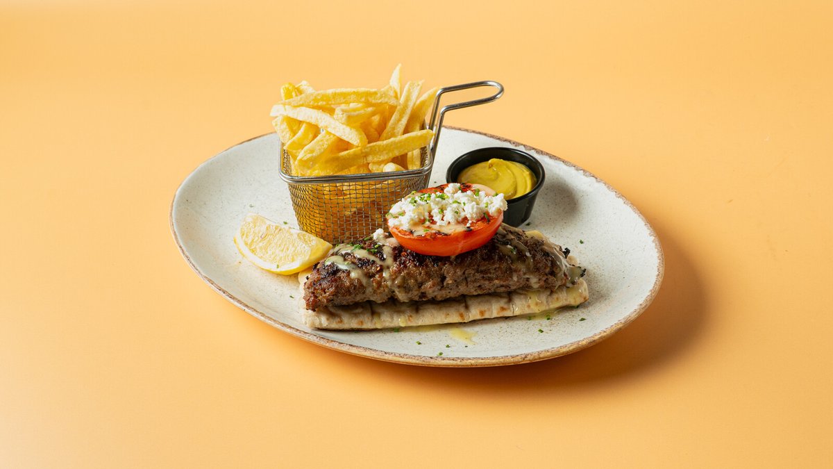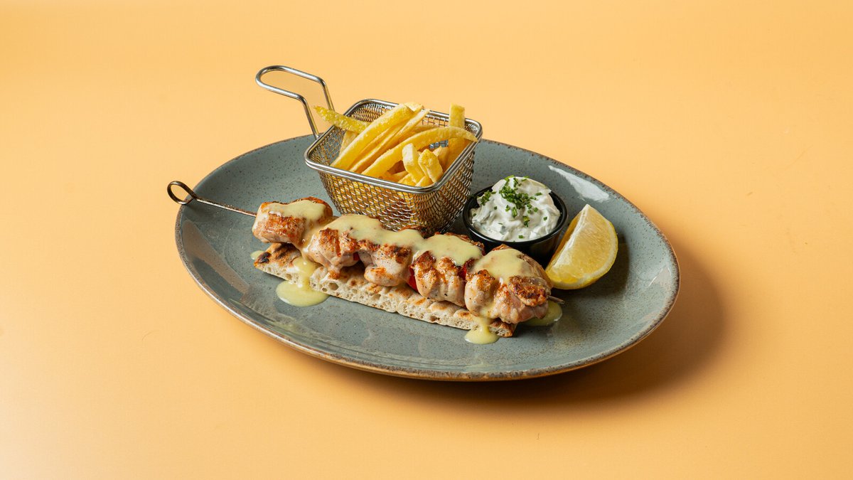 300 g. Συνοδεύεται από πατάτες τηγανητές, πίτα και τζατζίκι