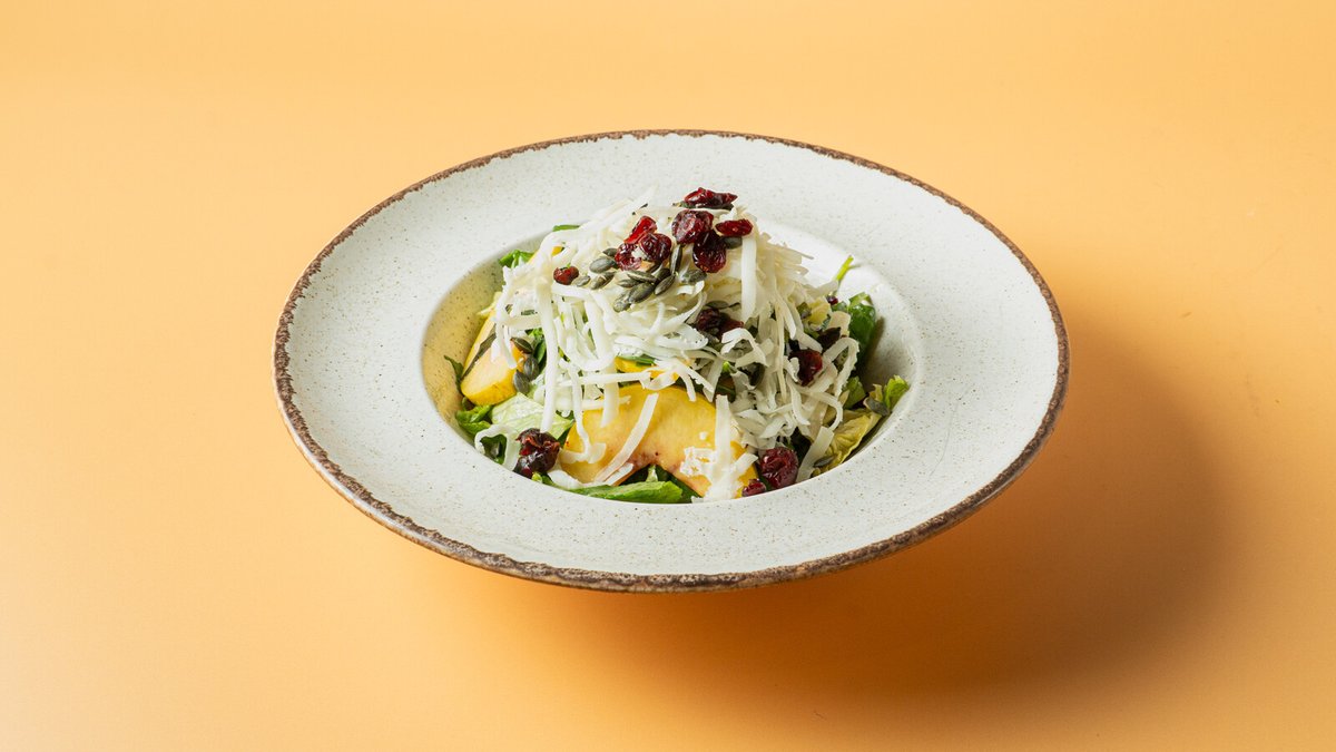 Σαλάτα με mix πράσινων λαχανικών, κολοκυθόσπορο, cranberries, φιλετάκια πορτοκάλι και dressing μουστάρδα, μέλι, λεμόνι και ελαιόλαδο