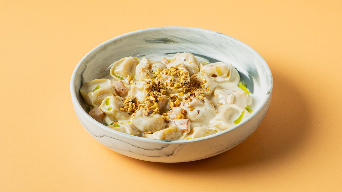 Φρέσκα. Με κρέμα τυριών, παστράμι κοτόπουλο και πούδρα από φυστίκι Αιγίνης