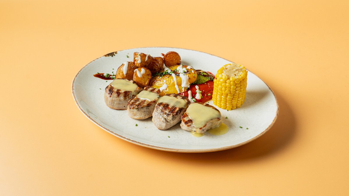 Φιλέτο χοιρινό. Συνοδεύεται από πατάτες baby, λαχανικά εποχής και λαδολέμονο μουστάρδας