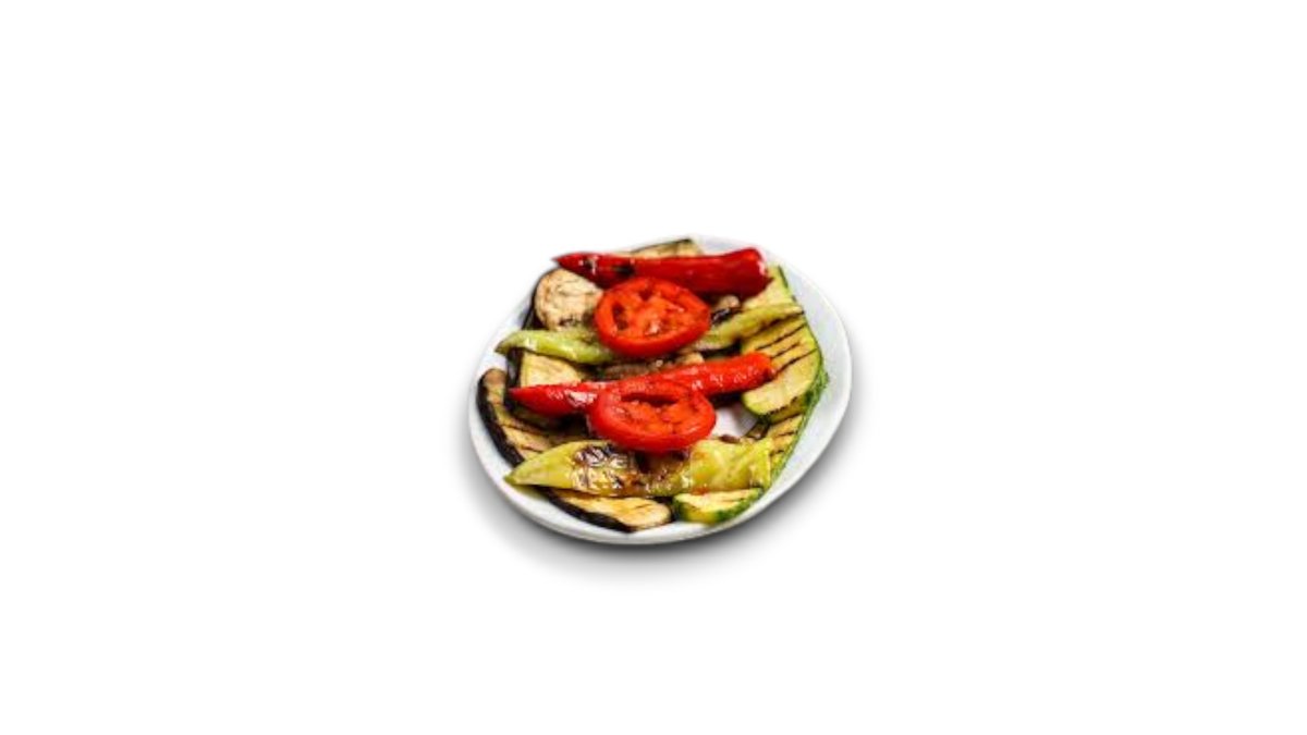 Με πολύχρωμες πιπεριές, κολοκύθι, ντομάτα, μελιτζάνα, ρόκα, παρμεζάνα και dressing βαλσάμικο