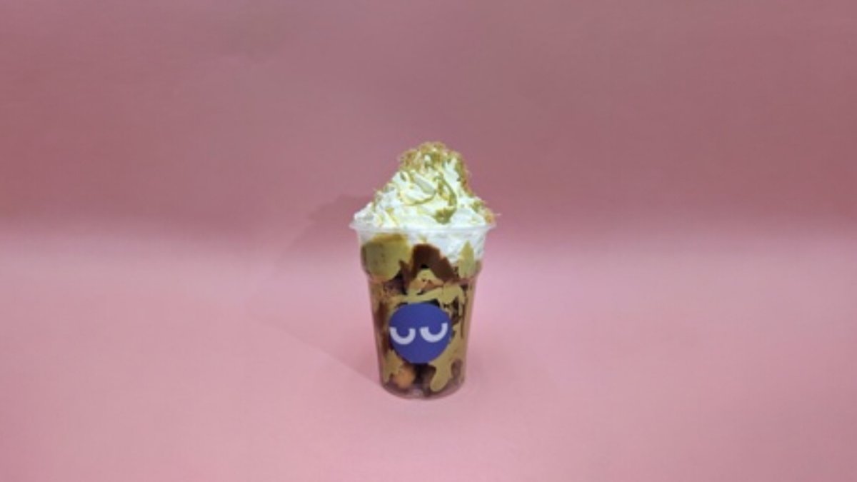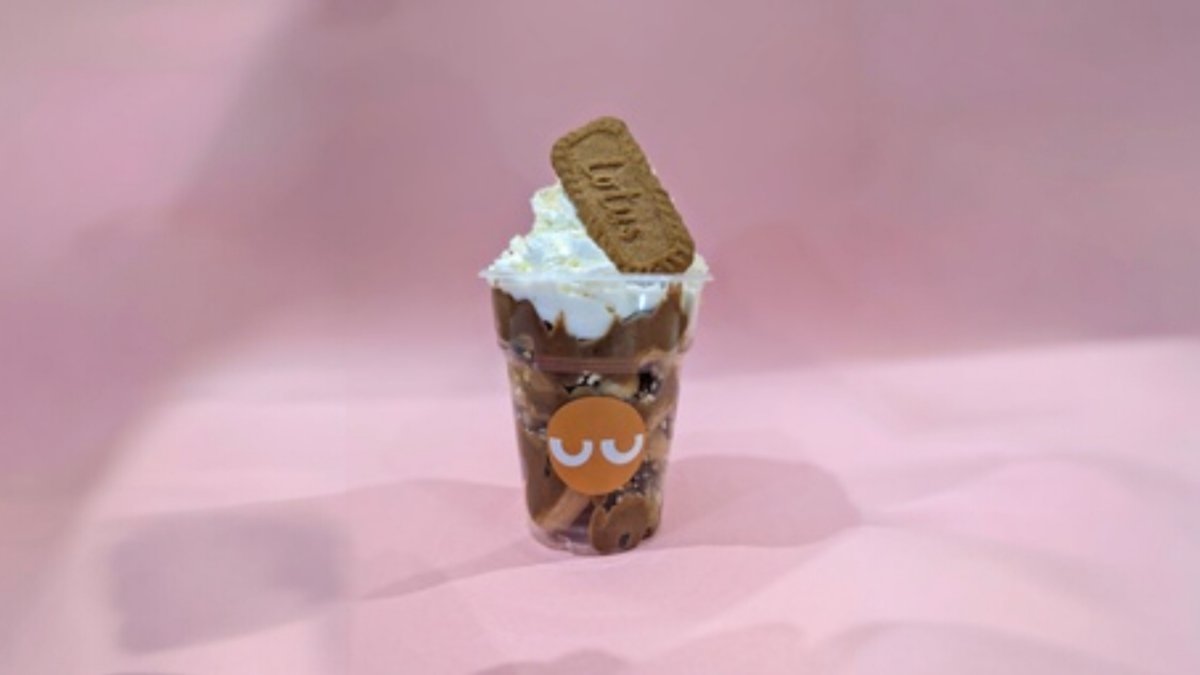Με παγωτό σοκολάτα, σιρόπι μπισκότο, μπισκότο τριμμένο και σαντιγύ