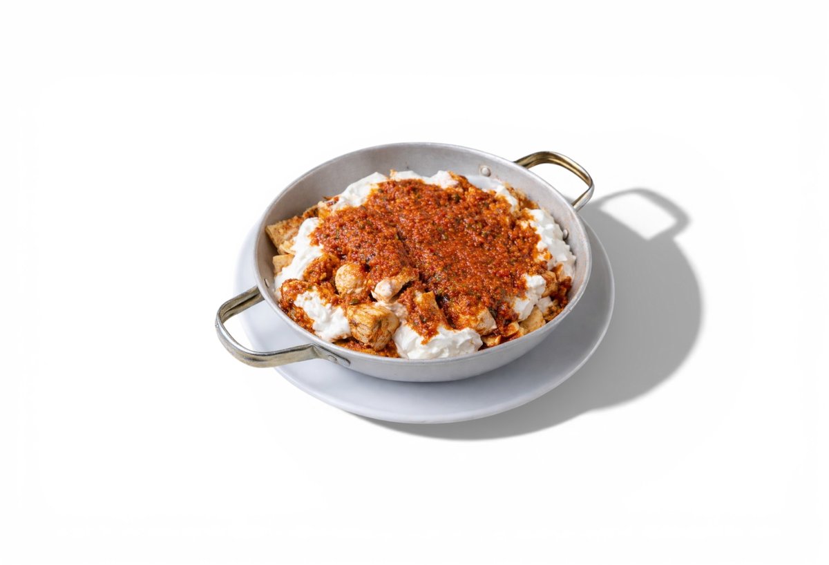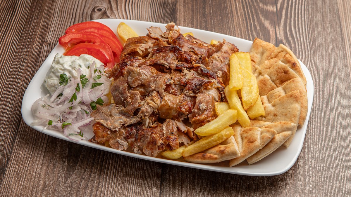 Συνοδεύεται απο πατάτες τηγανητές, πίτα, ντομάτα, κρεμμύδι, γιαούρτι και κόκκινη σάλτσα ντομάτας