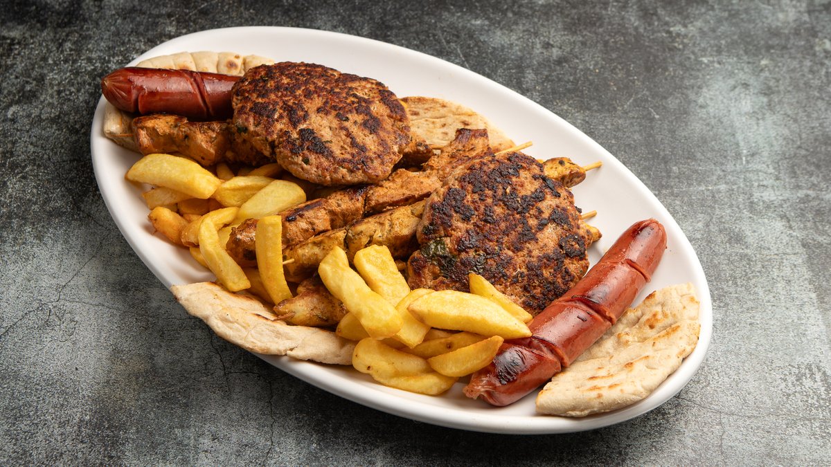 Με 1 λουκάνικο χωριάτικο, 2 πανσέτα, 2 σουβλάκι χοιρινό, 2 σουβλάκι κοτόπουλο και 2 μπιφτέκι χοιρινό. Συνοδεύεται από πατάτες τηγανητές και πίτα