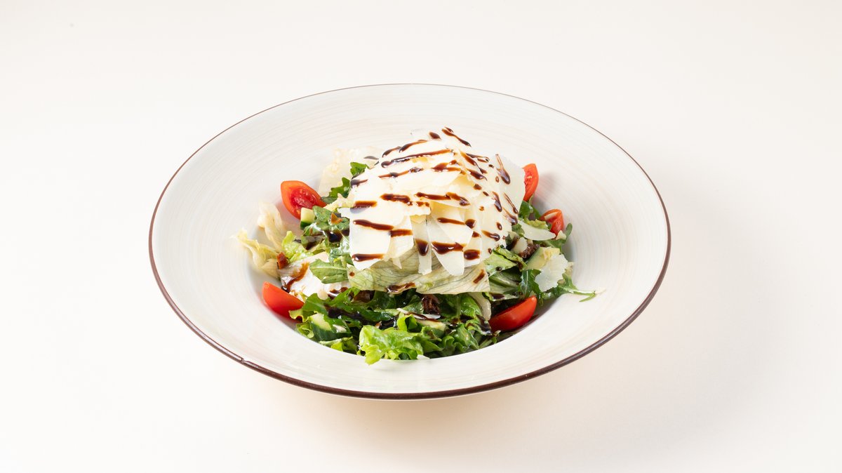 Σαλάτα με μαρούλι, ντοματίνια, αγγούρι, παρμεζάνα, λιαστή ντομάτα, mix ξηρών καρπών και βαλσάμικο