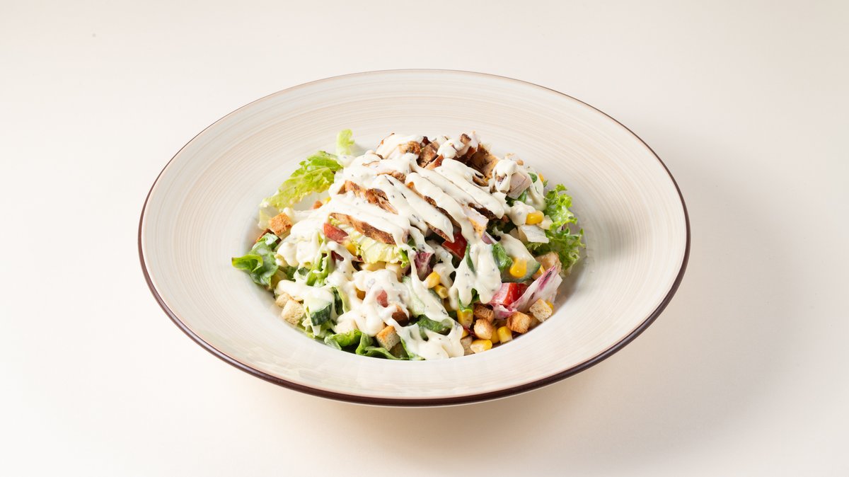 Σαλάτα με μαρούλι, ντομάτα, αγγούρι, κοτόπουλο, gouda, καλαμπόκι, κρουτόν και dressing μουστάρδας