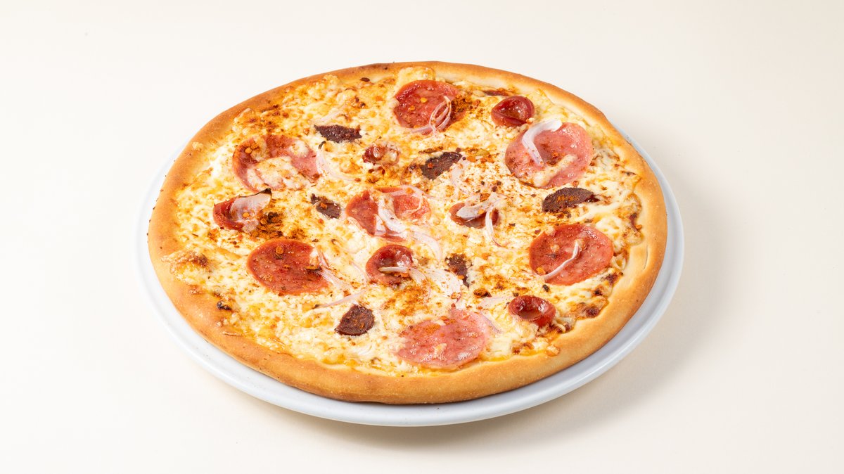8 Κομμάτια. 30 cm. Καυτερή. Με σάλτσα ντομάτας, gouda, σουτζούκι, λουκάνικο πεπερόνι, σαλάμι πεπερόνι, φέτα και κρεμμύδι
