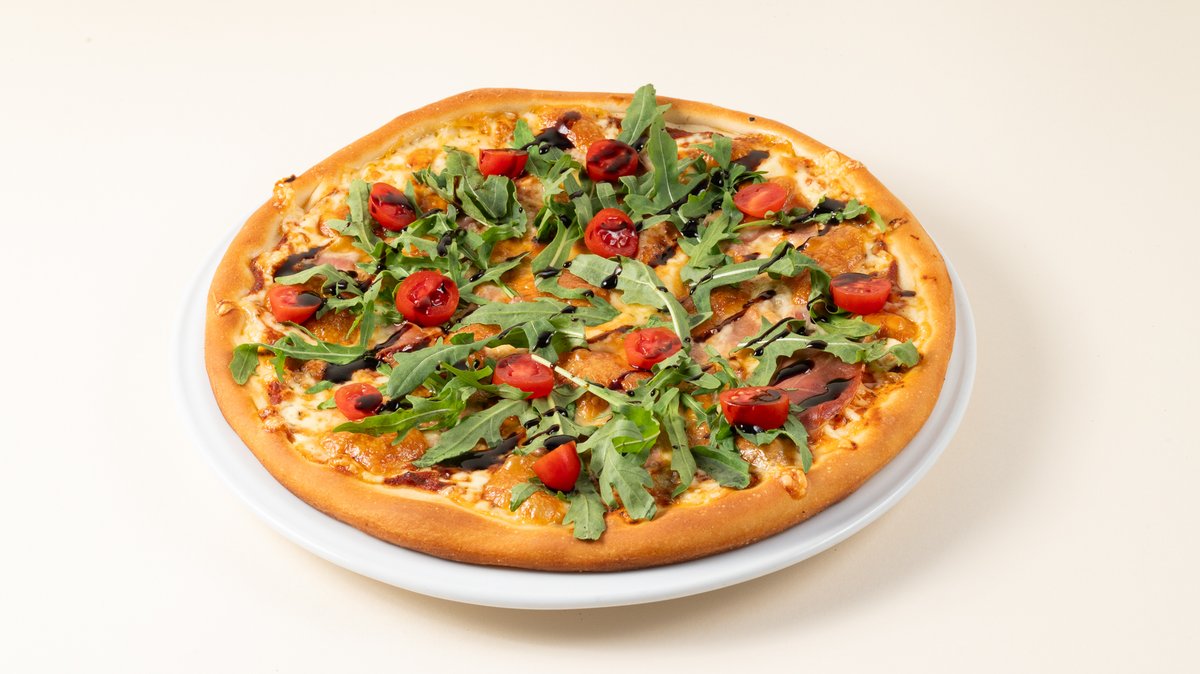 8 Κομμάτια. 30 cm. Με σάλτσα ντομάτας, gouda, ζαμπόν και μπέικον