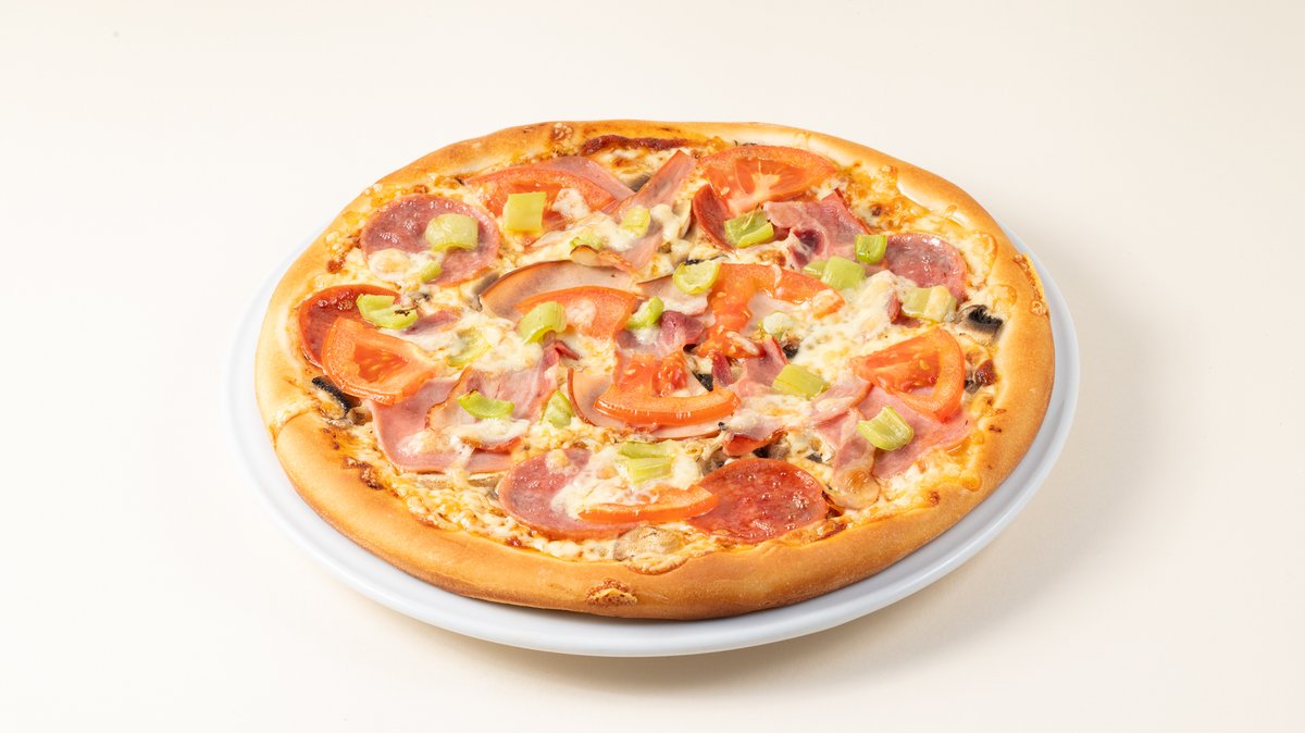 8 Κομμάτια. 30 cm. Με σάλτσα ντομάτας, gouda, ζαμπόν, μπέικον, σαλάμι πεπερόνι, πιπεριά, μανιτάρια και φρέσκια ντομάτα