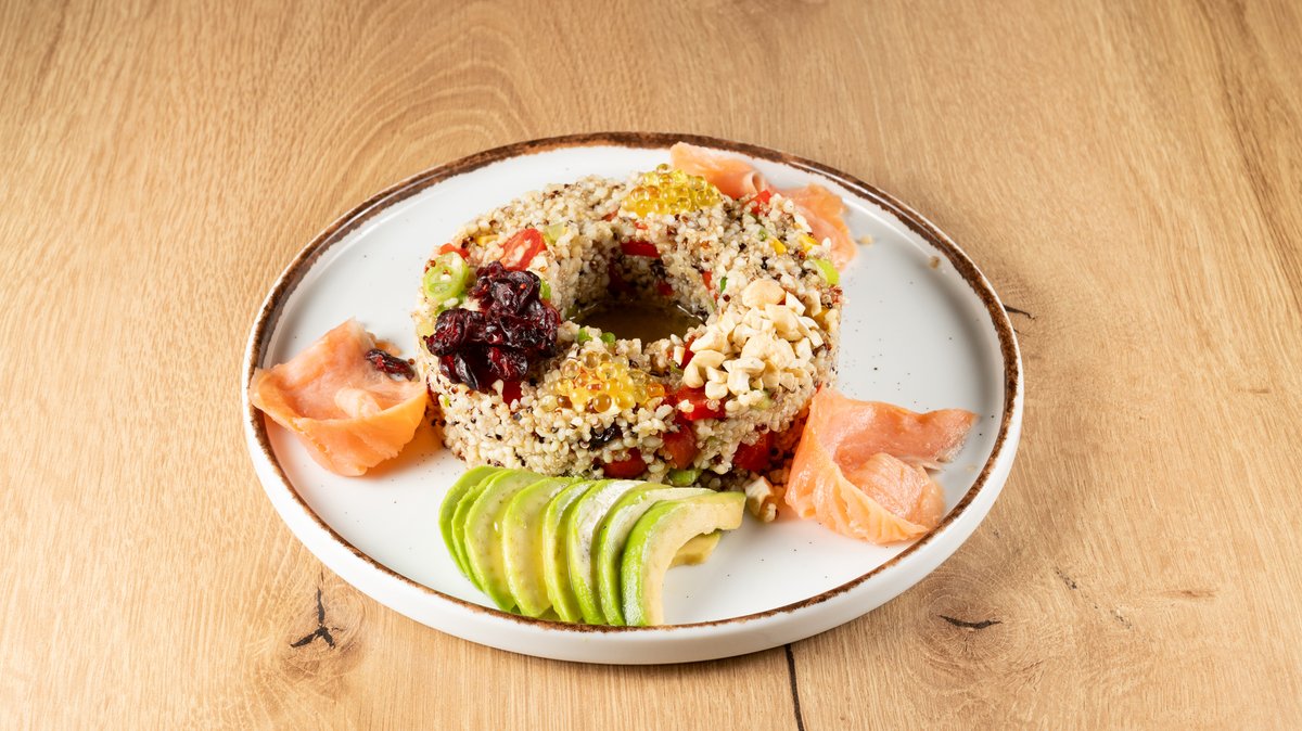 Με πολύχρωμη κινόα και πλιγούρι, καλαμπόκι, ντοματίνια, αβοκάντο, φρέσκο κρεμμύδι, βινεγκρέτ εσπεριδοειδών και κάσιους