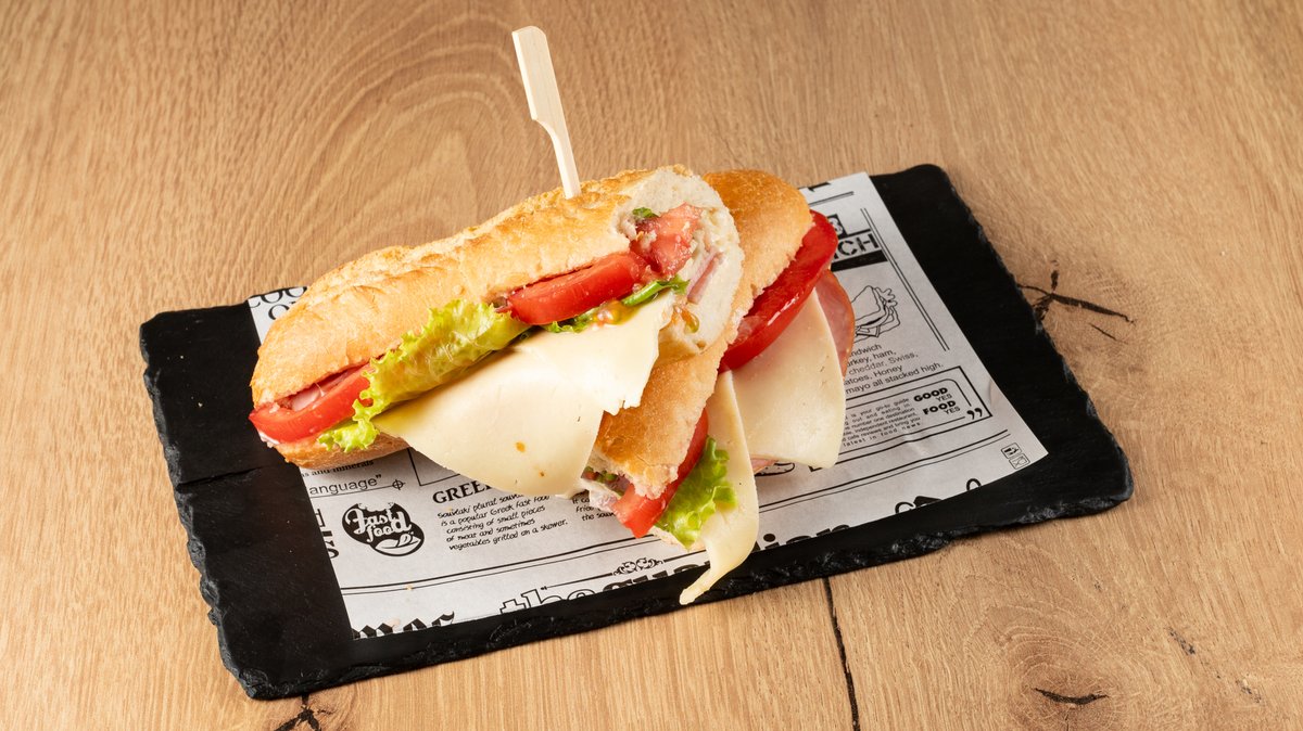 Μπαγκέτα με gouda, καπνιστό ζαμπόν, μαρούλι, ντομάτα και μαγιονέζα