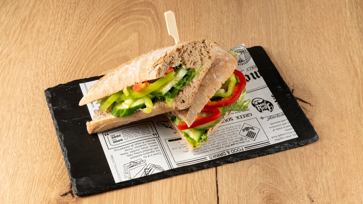 Μπαγκέτα με φέτα, αγγούρι, ντομάτα, πιπεριά και πάστα ελιάς