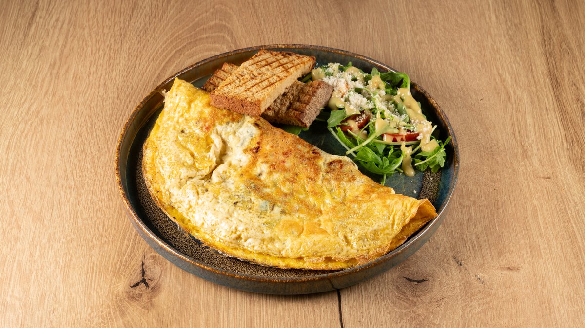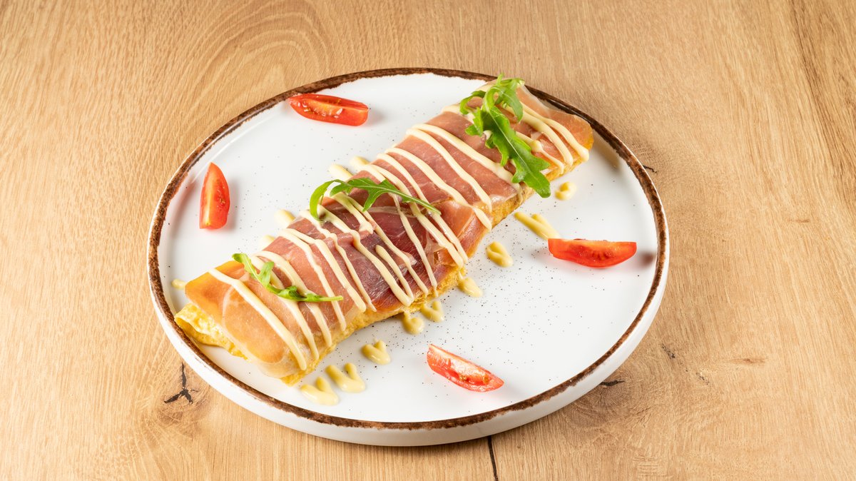 Αφράτη ομελέτα με τυρί κρέμα, μοτσαρέλα, προσούτο, πέστο βασιλικού και σάλτσα hollandaise