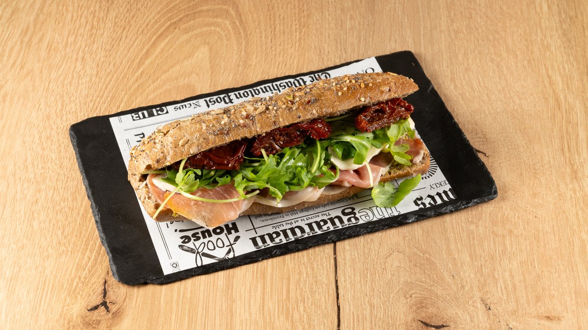 Μπαγκέτα ολικής με μοτσαρέλα, λιαστή ντομάτα, προσούτο, πέστο βασιλικού και ρόκα