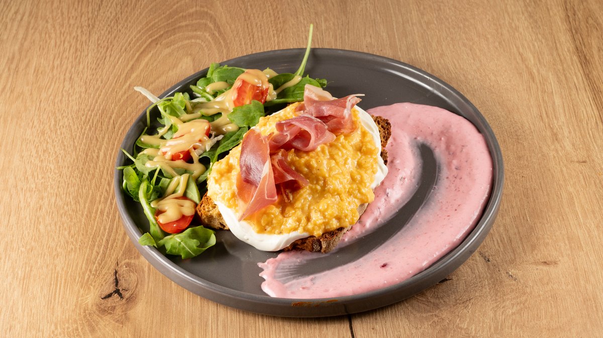 Αφράτα αυγά σκραμπλ, πάνω σε χωριάτικο ψωμάκι, σως ταρτάρ, τυρί κρέμα και προσούτο