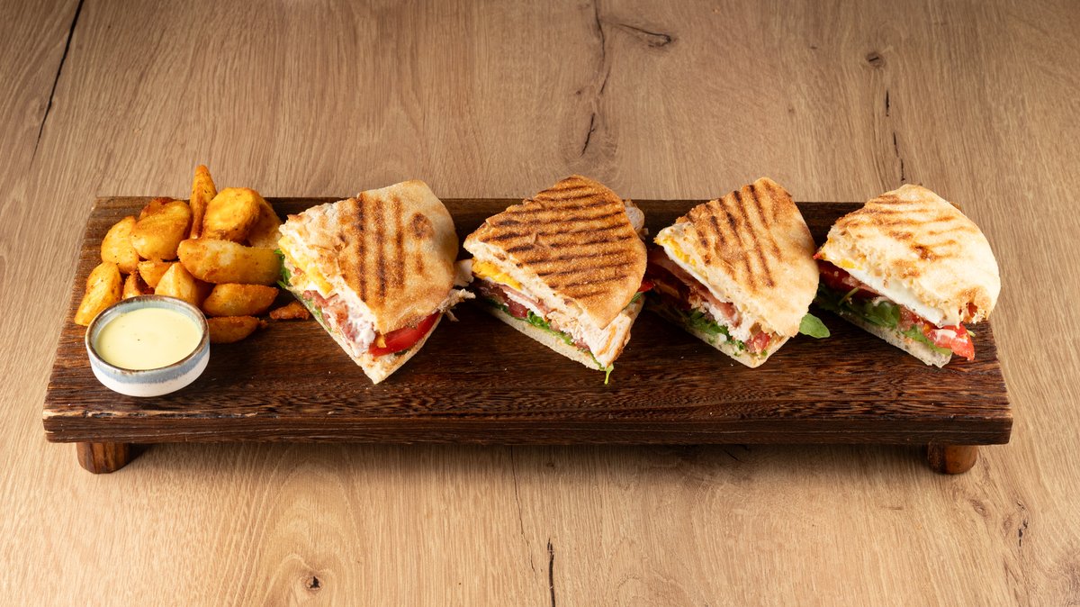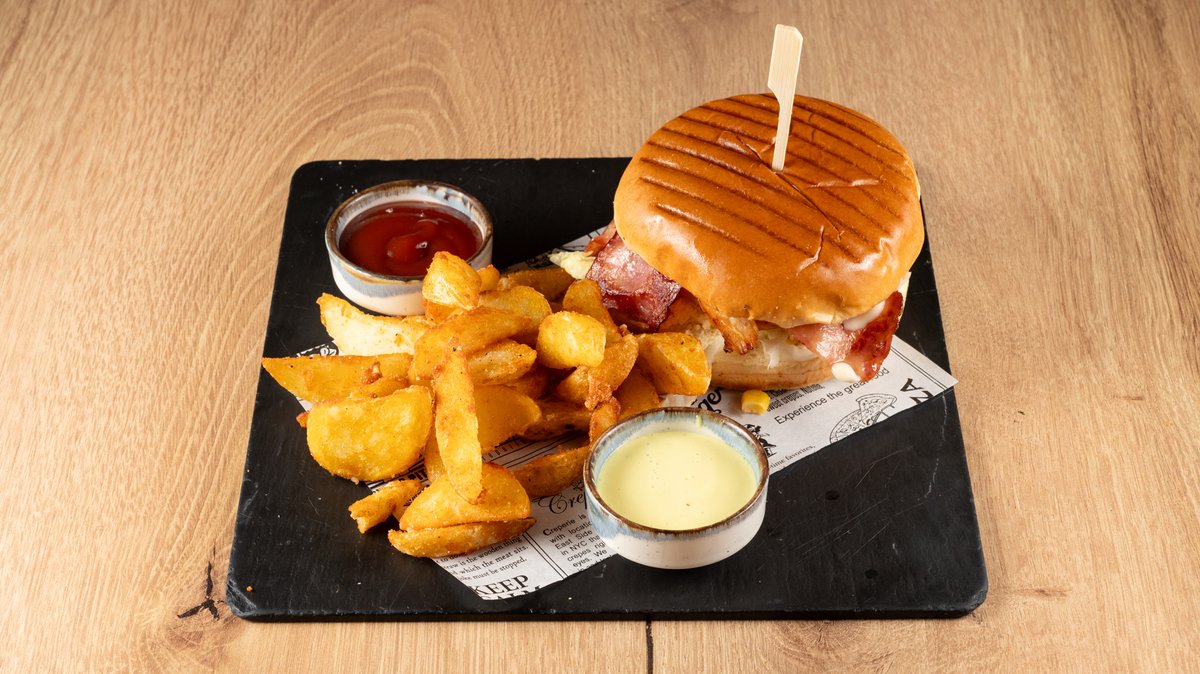 Ψωμί panini με γλυκόξινη μαγιονέζα, φιλέτο κοτόπουλο, αυγό, μπέικον, παρμεζάνα, ρόκα και ντομάτα. Συνοδεύεται με πατάτες