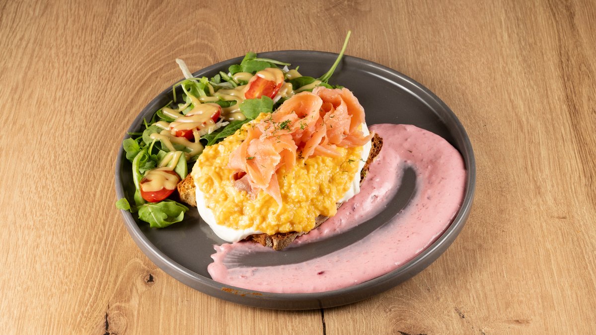 Αφράτα αυγά σκραμπλ πάνω σε χωριάτικο ψωμάκι, σολομό, τυρί κρέμα, ταλιατέλες αγγουριού και σως ταρτάρ